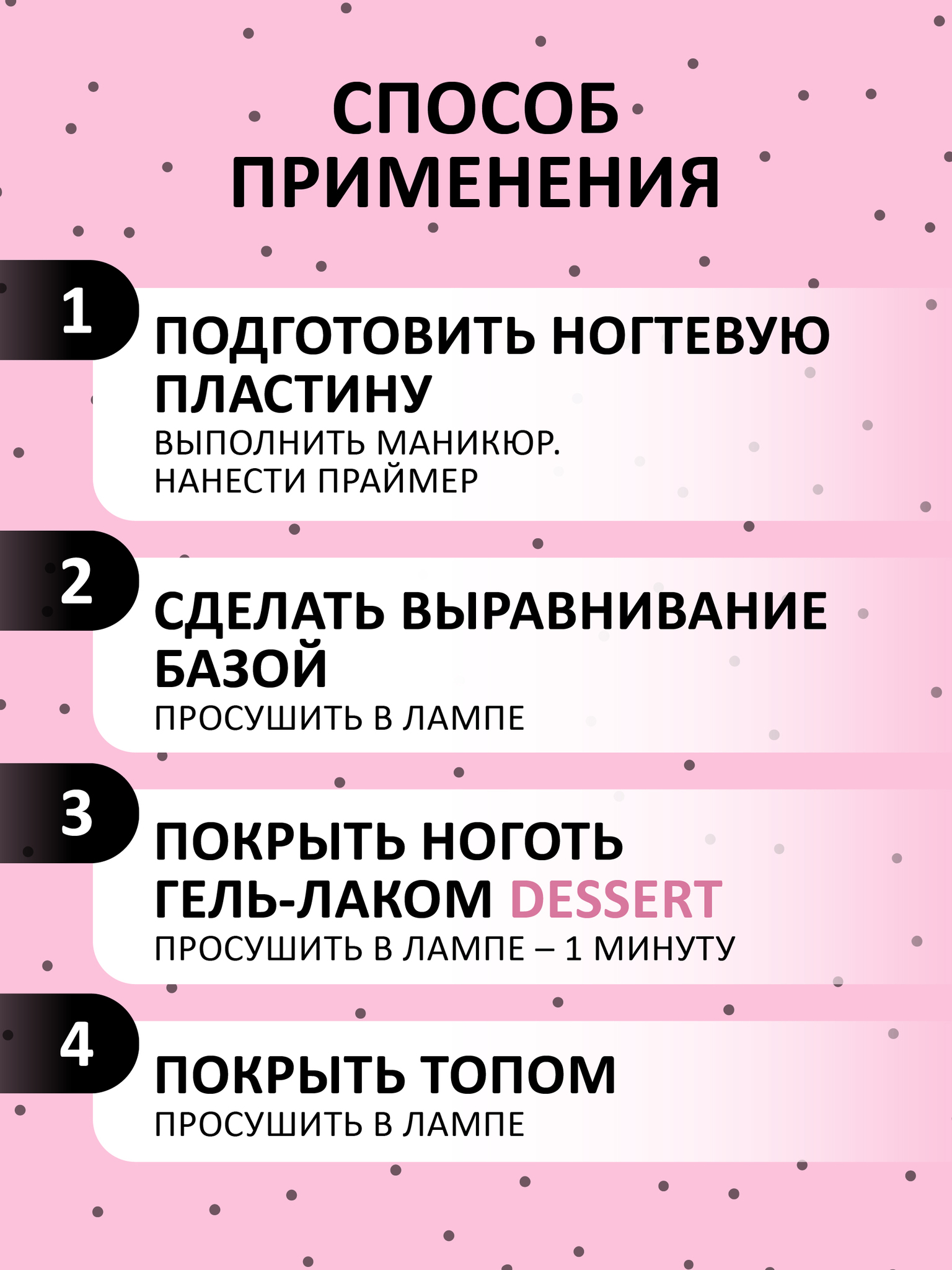 Палитра новой коллекции DESSERT это настоящее «лакомство» для трендового маникюра – яркие летние цвета приглушены молочной, десертной нежностью и эффектно дополнены деликатными хлопьями.