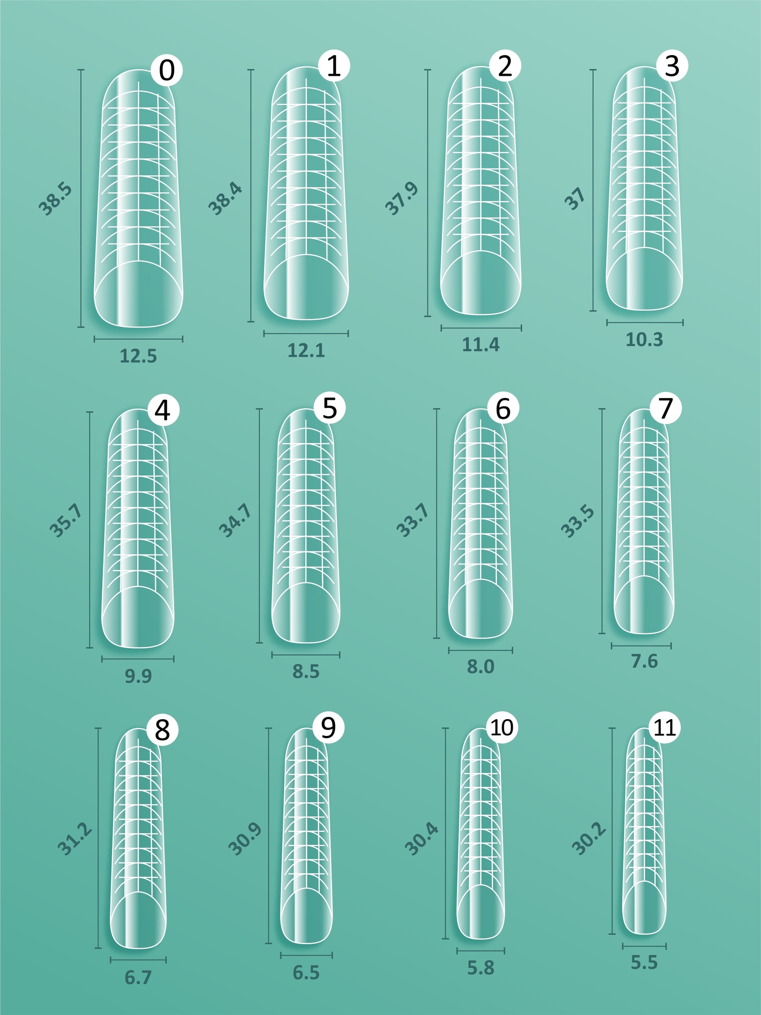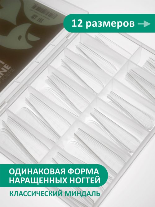 Верхние формы отлично садятся на ноготь (комплект включает в себя 12 размеров), обеспечивают оптимальную толщину наращенного свободного края.