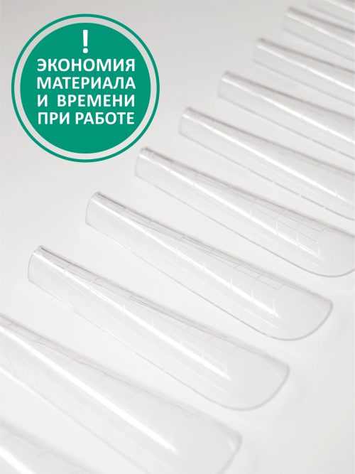 Наращенные таким образом ногти почти не требуют опила. Четкая разметка делает процедуру быстрой, легкой и эффективной.
